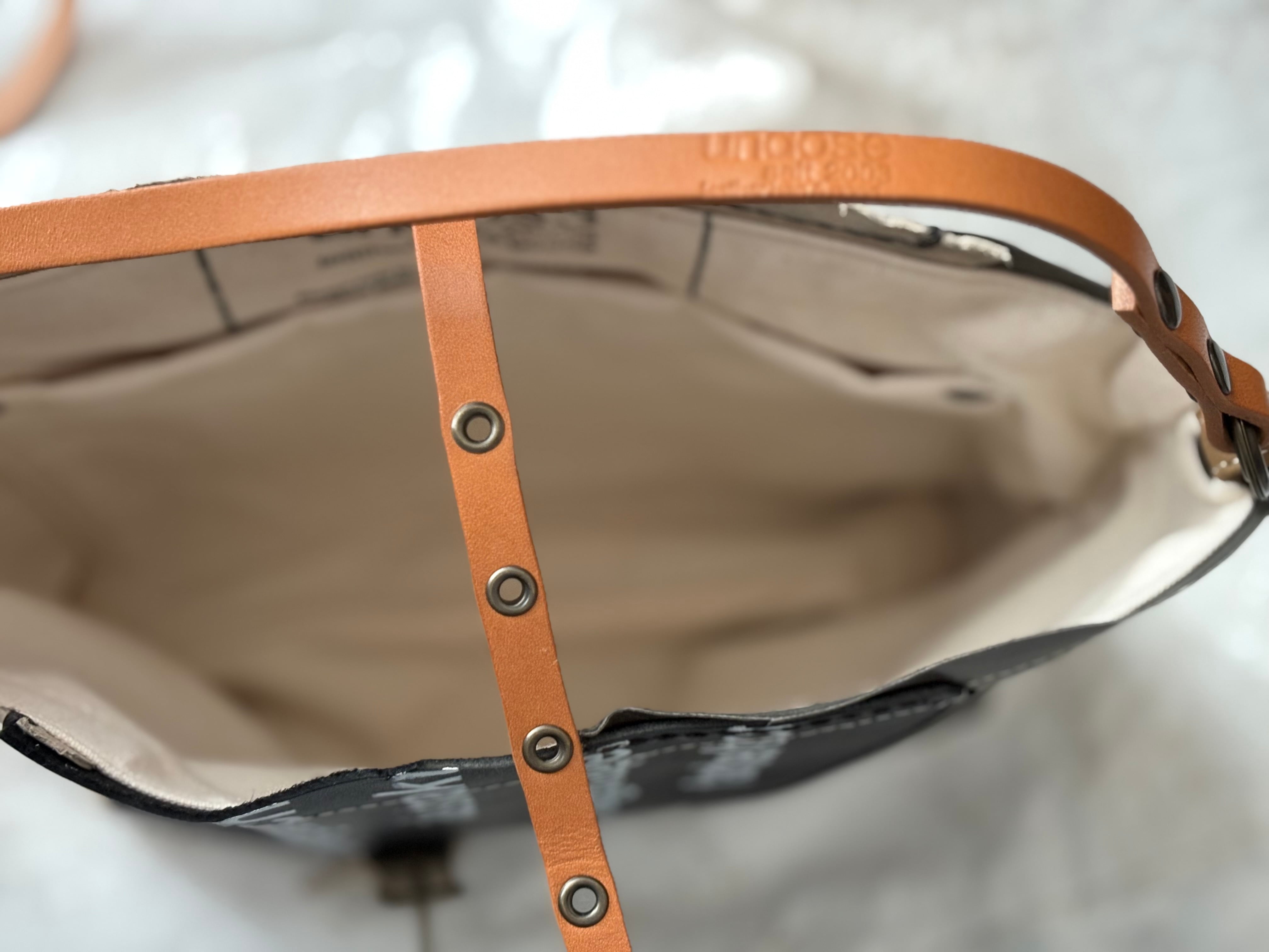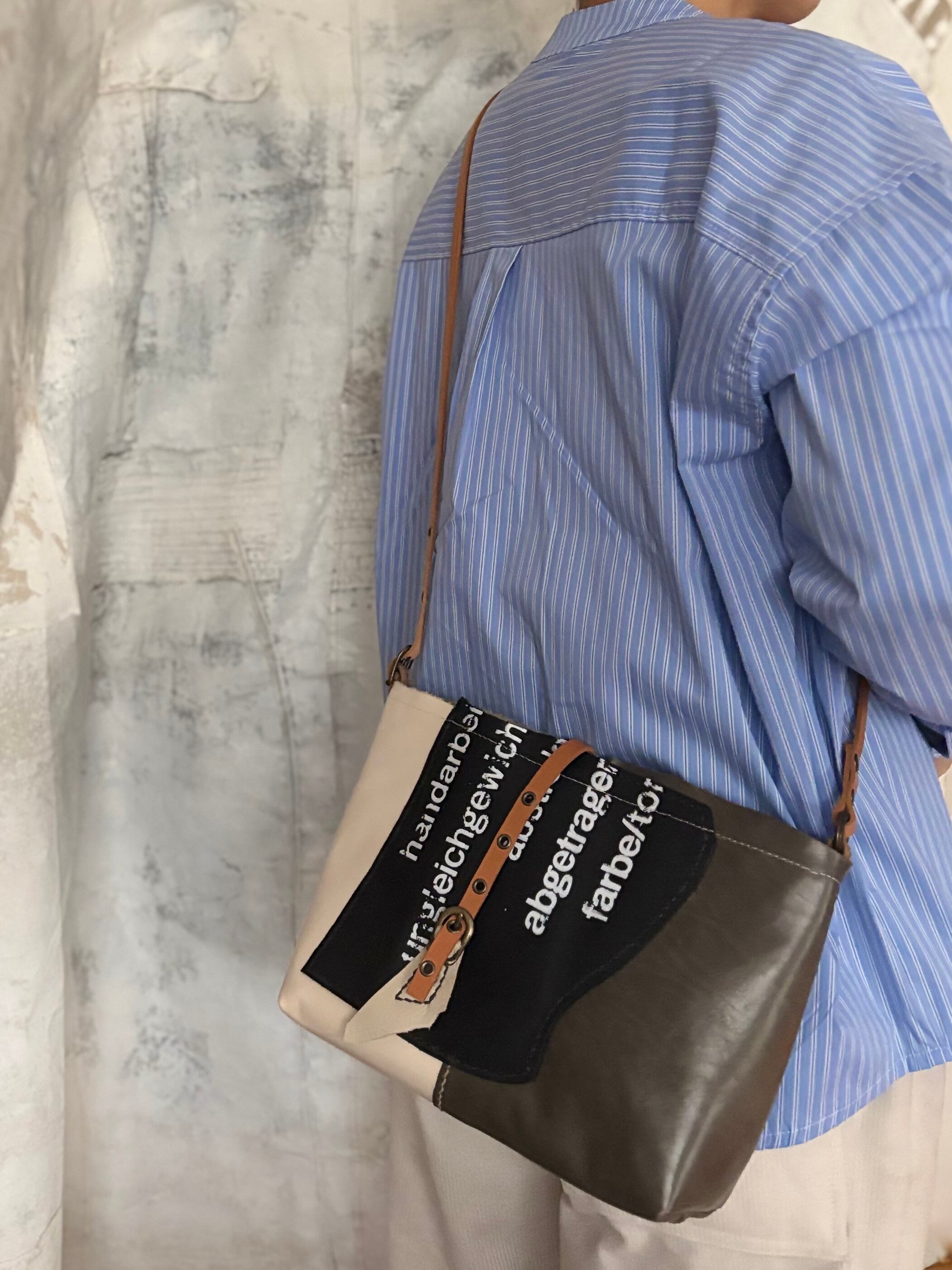 斜め掛けにしたり、ショルダーヒモを結んで肩掛けにも。